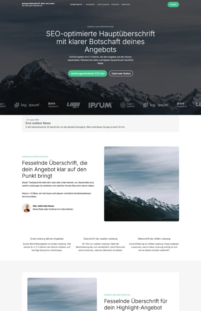 „Sehr gute Webseiten.de“ ermöglicht es Inhaberinnen und Inhabern, Markenverantwortlichen, Event- Planerinnen und Planern, Spendensammlern, Selbstständigen und vielen Berufsgruppen eine Leistungsstarke und toll gestaltete Webseite zu mieten. Mit einer monatlichen Miete und sehr günstigen einmaligen Angeboten zur Erstellung, minimierst du den finanziellen Aufwand eine Webseite zu erstellen.