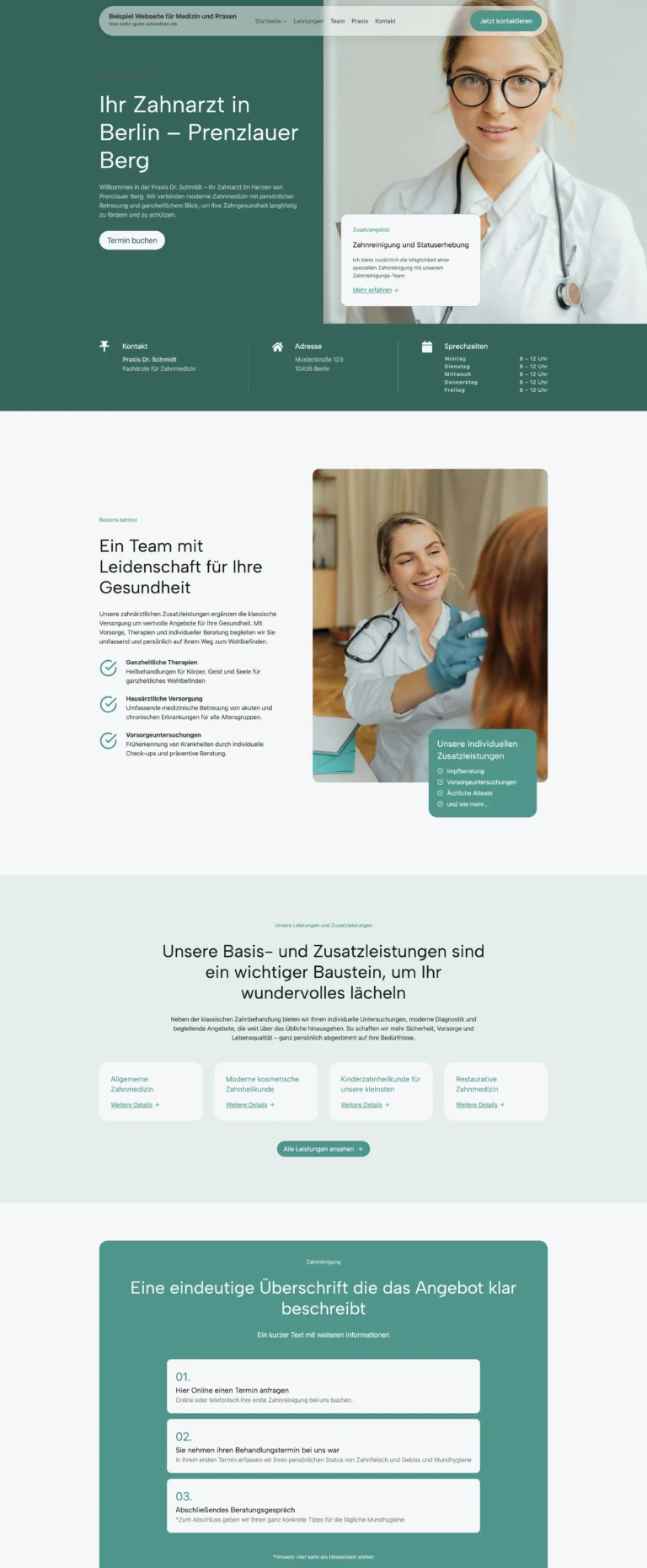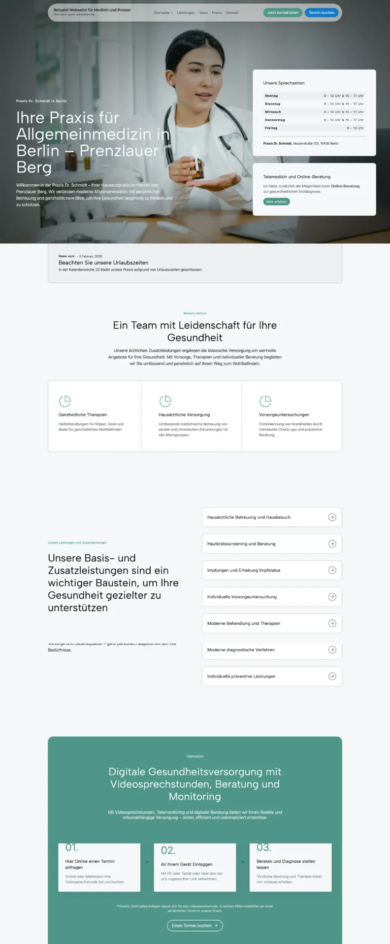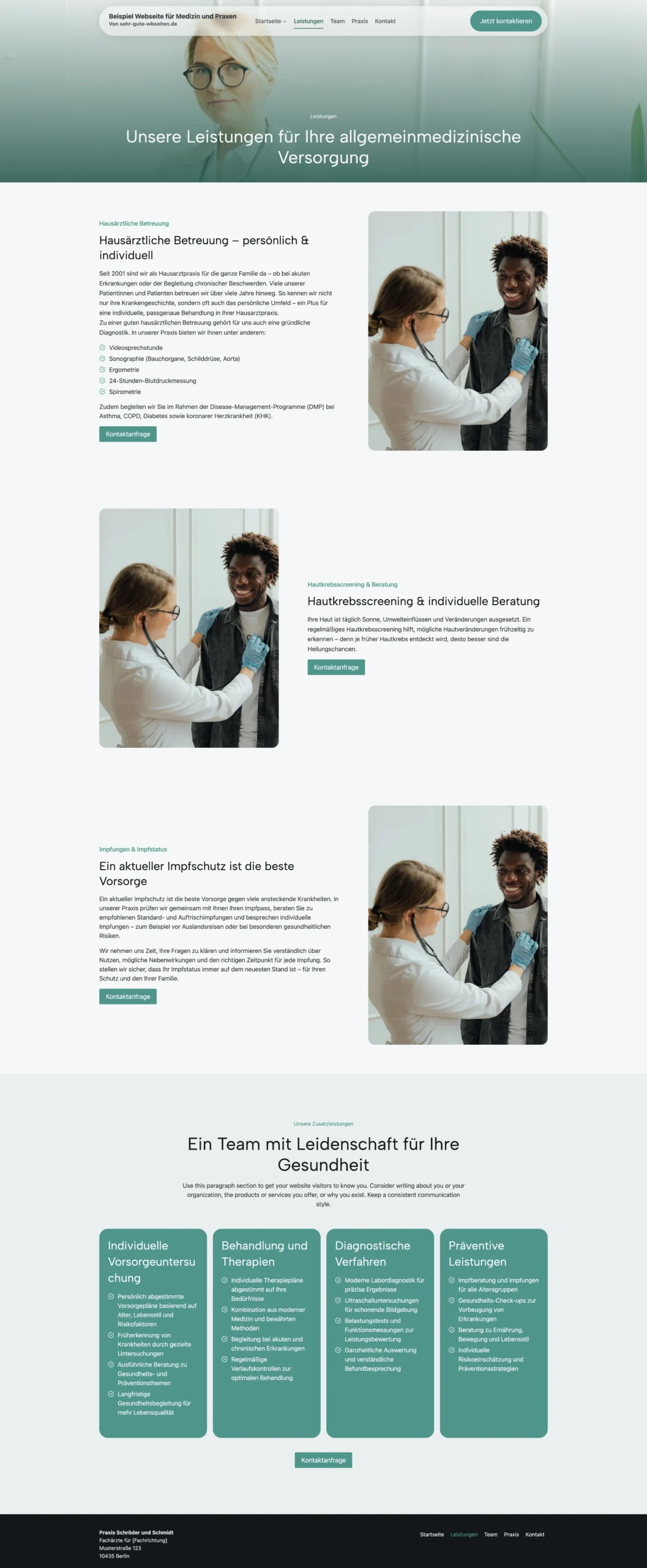 Wir erstellen diese Webseite für Ärzte, Praxen und Medizin. Die Website für Praxen und medizinische Einrichtungen beeindruckt mit einem modernen, vertrauensvollen Design, das Professionalität und menschliche Nähe harmonisch verbindet. Klare Strukturen, ruhige Farben und authentische Bildwelten schaffen sofort Orientierung und vermitteln Seriosität. Mit übersichtlich präsentierten Leistungen, Öffnungszeiten, Teamvorstellung und digitalen Serviceangeboten bietet die Seite Patienten einen intuitiven Zugang zu Informationen und erleichtert die direkte Kontaktaufnahme. Diese Vorlage stärkt das professionelle Erscheinungsbild jeder Praxis und unterstützt eine moderne, patientenfreundliche Kommunikation.