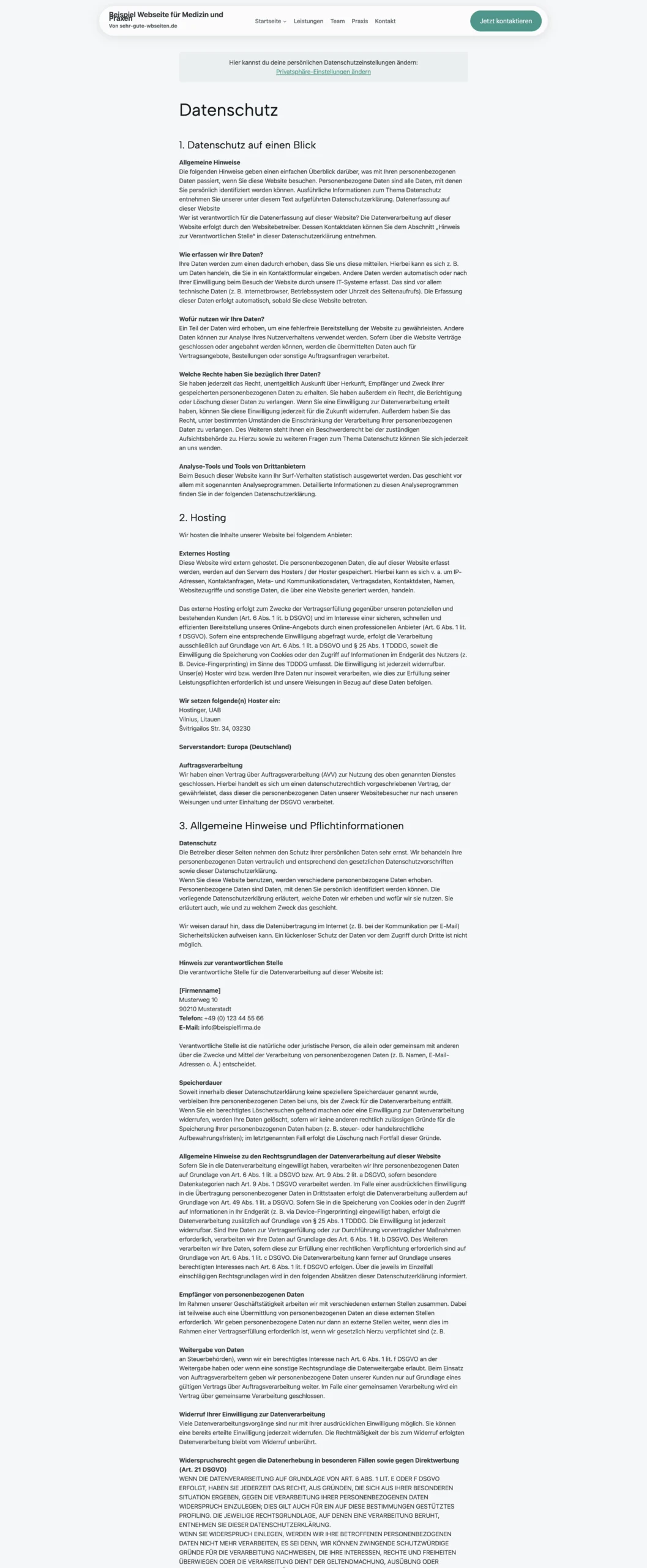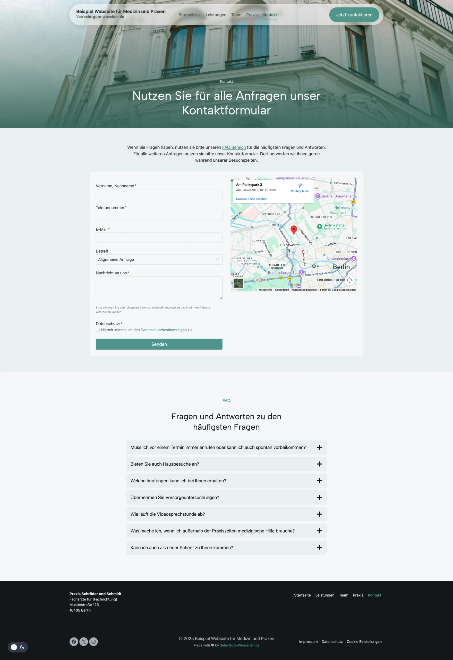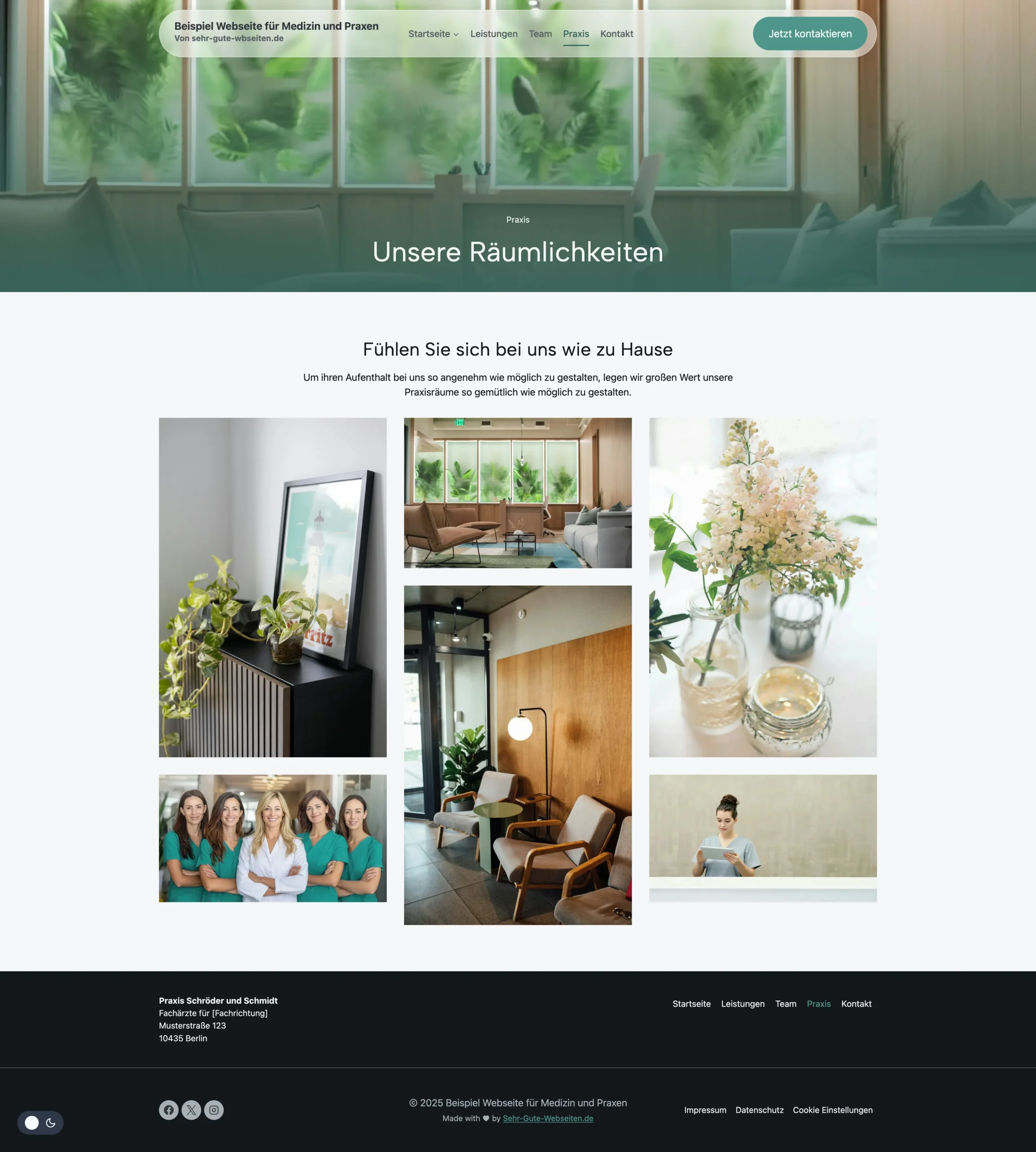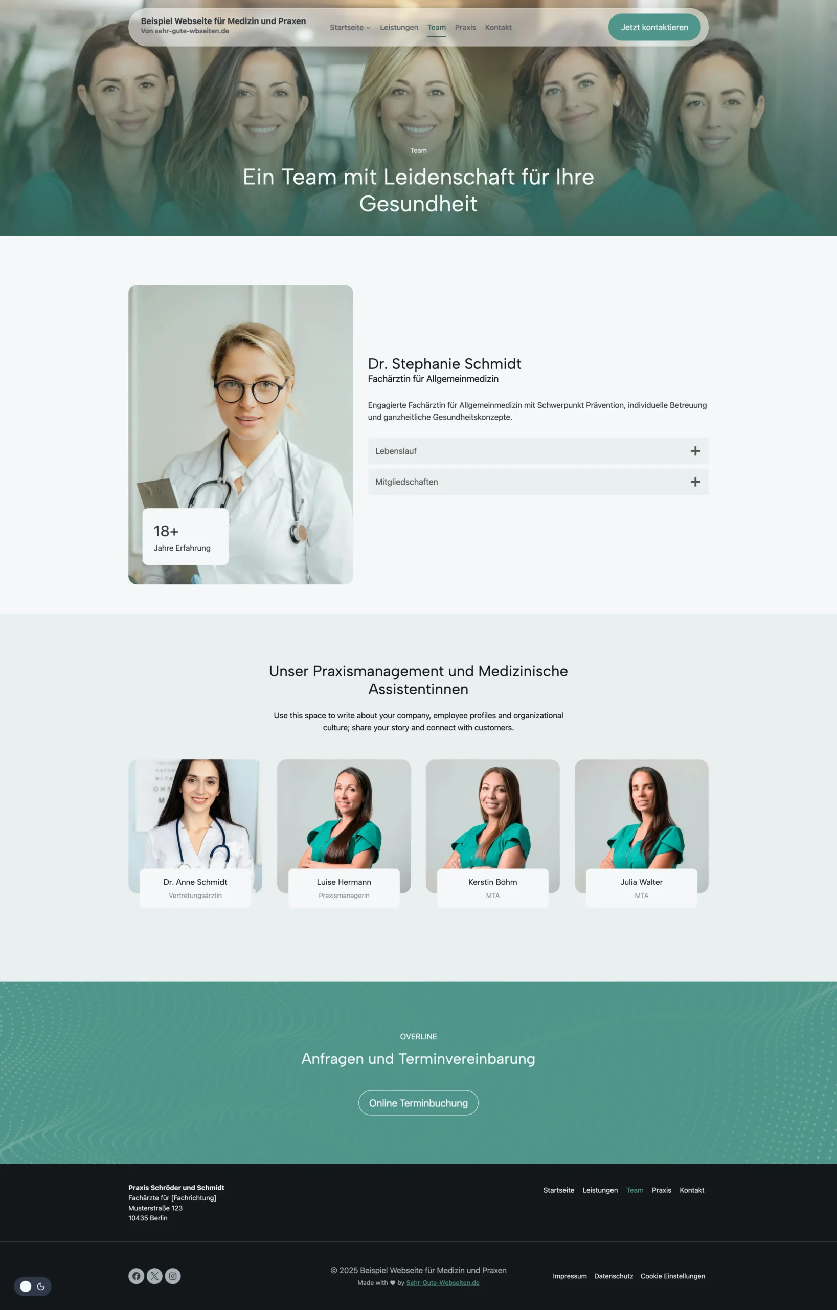 Wir erstellen diese Webseite für Ärzte, Praxen und Medizin. Die Website für Praxen und medizinische Einrichtungen beeindruckt mit einem modernen, vertrauensvollen Design, das Professionalität und menschliche Nähe harmonisch verbindet. Klare Strukturen, ruhige Farben und authentische Bildwelten schaffen sofort Orientierung und vermitteln Seriosität. Mit übersichtlich präsentierten Leistungen, Öffnungszeiten, Teamvorstellung und digitalen Serviceangeboten bietet die Seite Patienten einen intuitiven Zugang zu Informationen und erleichtert die direkte Kontaktaufnahme. Diese Vorlage stärkt das professionelle Erscheinungsbild jeder Praxis und unterstützt eine moderne, patientenfreundliche Kommunikation.