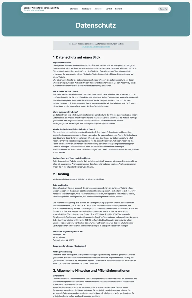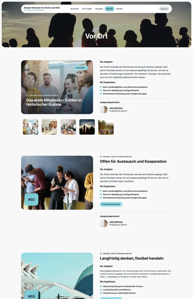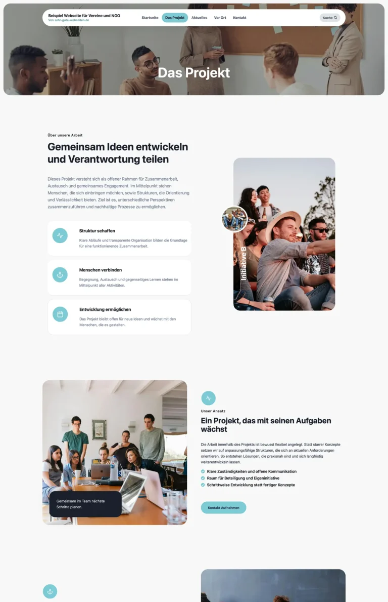 Wir erstellen für dich diese Webseite für Vereine und NGO. Das Webdesign ist wie gemacht für Vereine und NGOs, die Menschen erreichen und bewegen wollen. Die klare Struktur, großzügige Bildflächen und ruhige Farben schaffen sofort Vertrauen. Inhalte wie Projekte, Engagement-Themen, Blog und Veranstaltungen sind übersichtlich aufgebaut und leicht erfassbar. Persönliche Zitate, echte Fotos und klare Call-to-Actions machen Haltung und Wirkung sichtbar. Das Design wirkt modern, nahbar und professionell zugleich – perfekt, um Engagement zu zeigen, Mitstreiter zu gewinnen und eure Mission glaubwürdig nach außen zu tragen. Ideal für Organisationen, die ernst genommen werden wollen, ohne kühl zu wirken.